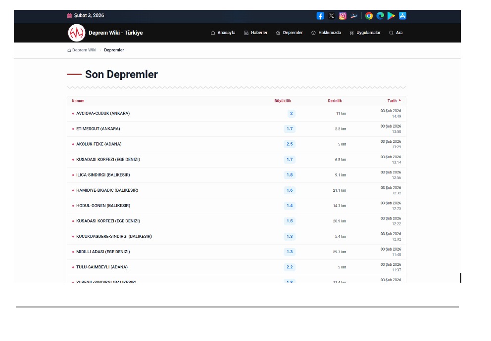 Kullanıcılar, son depremler hakkında büyüklük, merkez üssü, derinlik ve zaman bilgilerine tek bir sayfa üzerinden ulaşabiliyor. Türkiye’de meydana gelen depremler, sade bir arayüzle listelenerek özellikle afet anlarında bilgiye hızlı erişim sağlanıyor.